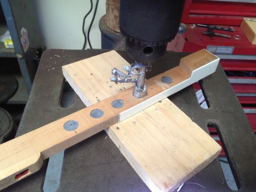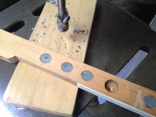 Now we are removing key leads by drilling them out with a forstner bit to balance the key weighting. |