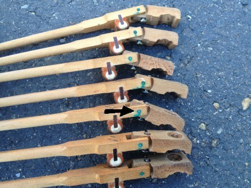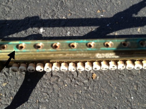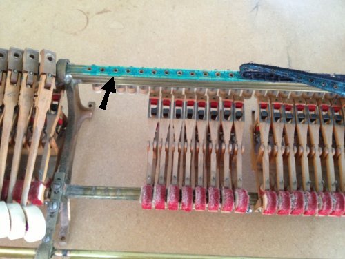 In this image, the arrow indicates the brass rail that mounts the Hammers, Shankes, and Hammer Flanges. As you can see, it is covered with green, "Verdigris" sludge. |